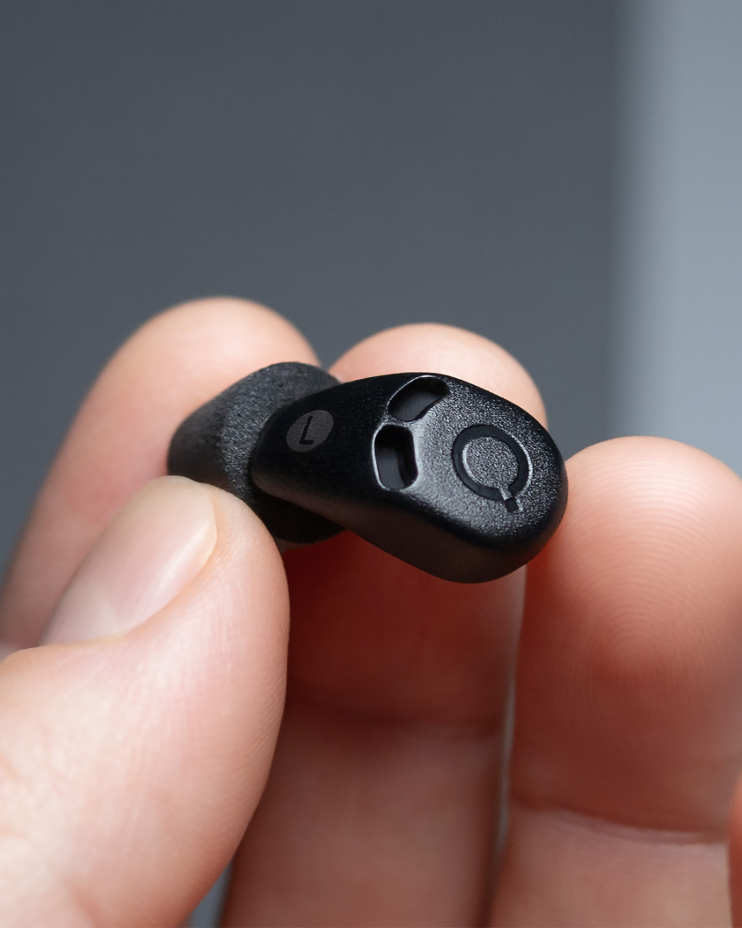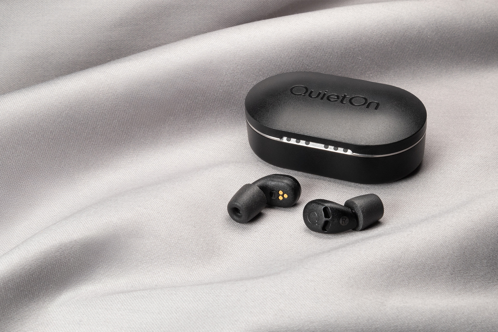 QuietOn 4 active noise cancelling sleep buds with oval‑shaped design fitting naturally into the ear for comfortable side sleeping.