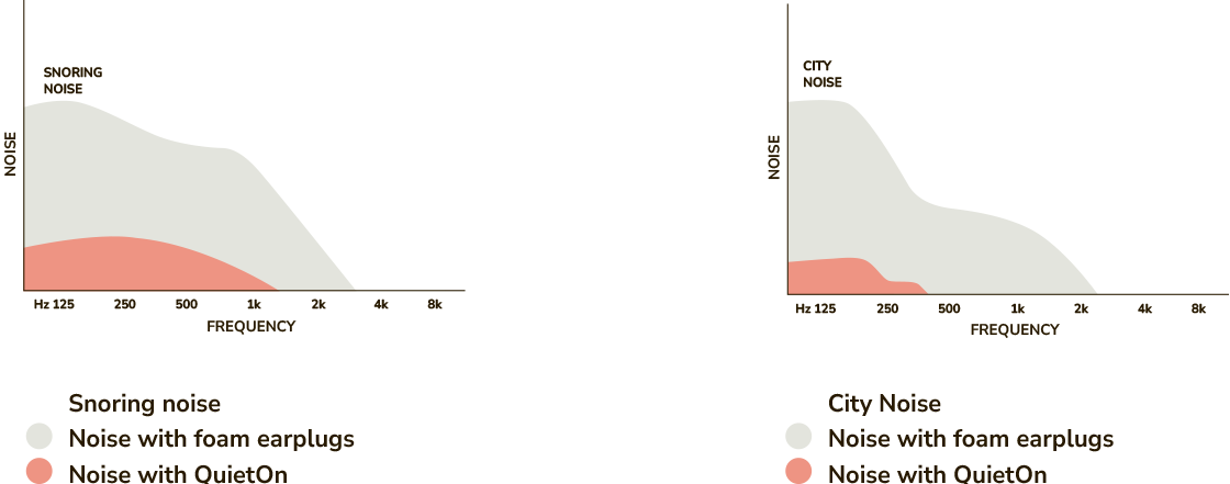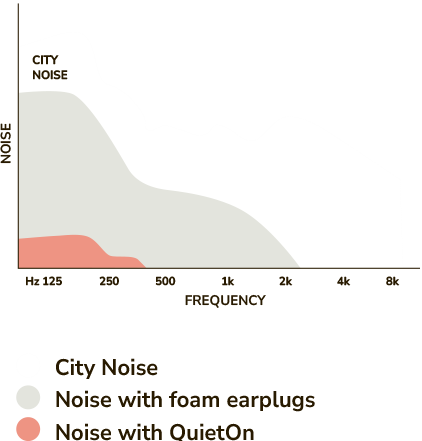 City noise typically consists of very low-frequency sounds. Although these sounds aren’t always loud, they can easily penetrate walls and pass through standard earplugs. QuietOn is designed to reduce these low-frequency noises almost completely.