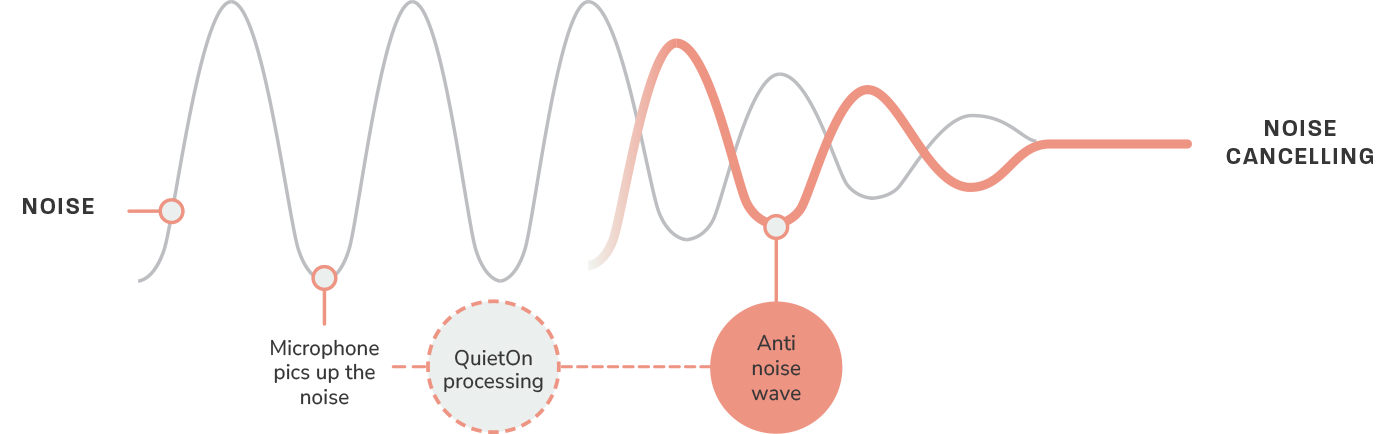 QuietOn 4 active noise-canceling earbuds with microphone detecting ambient noise, electronics generating anti-noise signal, rechargeable battery, and soft memory foam tips for superior comfort and smallest ANC design.